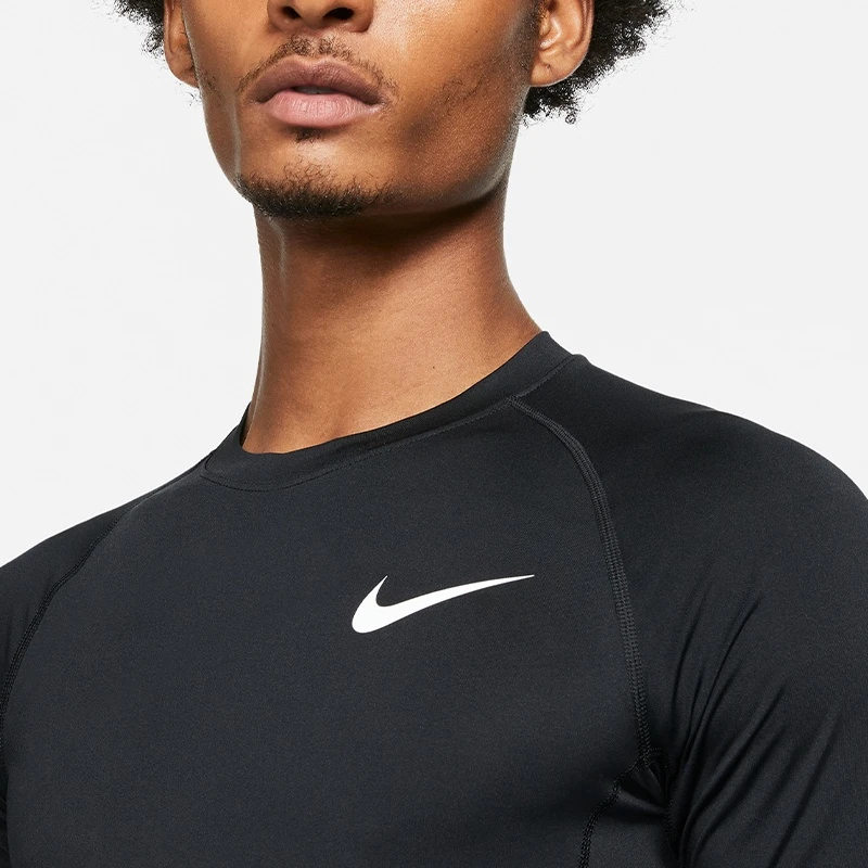 - Rundhals-Ausschnitt mit Einfassung und weichem Textil-Webband innen am Nacken, auf dem der NIKE PRO Schriftzug allover aufgedruckt ist