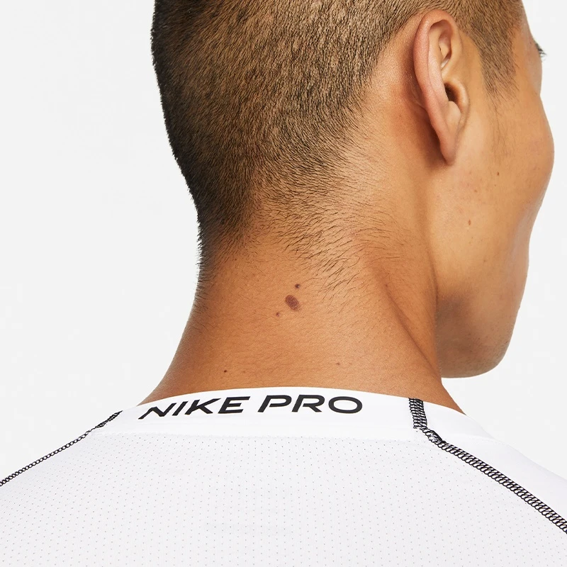 - Rundhals-Ausschnitt mit Einfassung und weichem Textil-Webband innen am Nacken, auf dem der NIKE PRO Schriftzug allover aufgedruckt ist