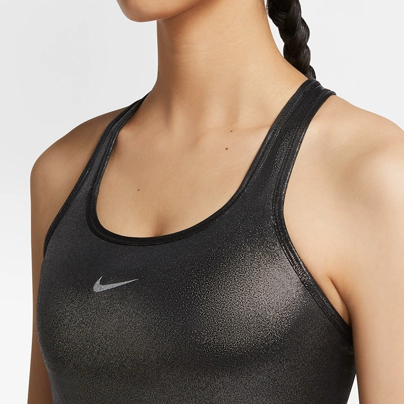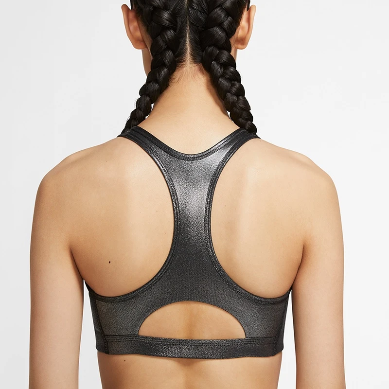 Glänzender Silber Look! Schweißableitendes Design für Halt bei Aktivitäten mit mittlerer Belastung. Der gepolsterte Nike Shimmer Swoosh Bra Women mit herausnehmbarem Polster kombiniert Kompressionsmaterial mit schweißableitender Technologie und hält Dich bei Aktivitäten mit mittlerer Belastung angenehm trocken. Das Racerback-Design ermöglicht natürliche Bewegungsfreiheit. Individueller Schutz: Die abnehmbare, einteilige Polsterung wurde für eine sichere, bequeme Passform entwickelt, um ein Verrutschen oder Umschlagen zu verhindern. Die Polstertasche lässt sich von oben öffnen und eignet sich ideal für Dein Smartphone.