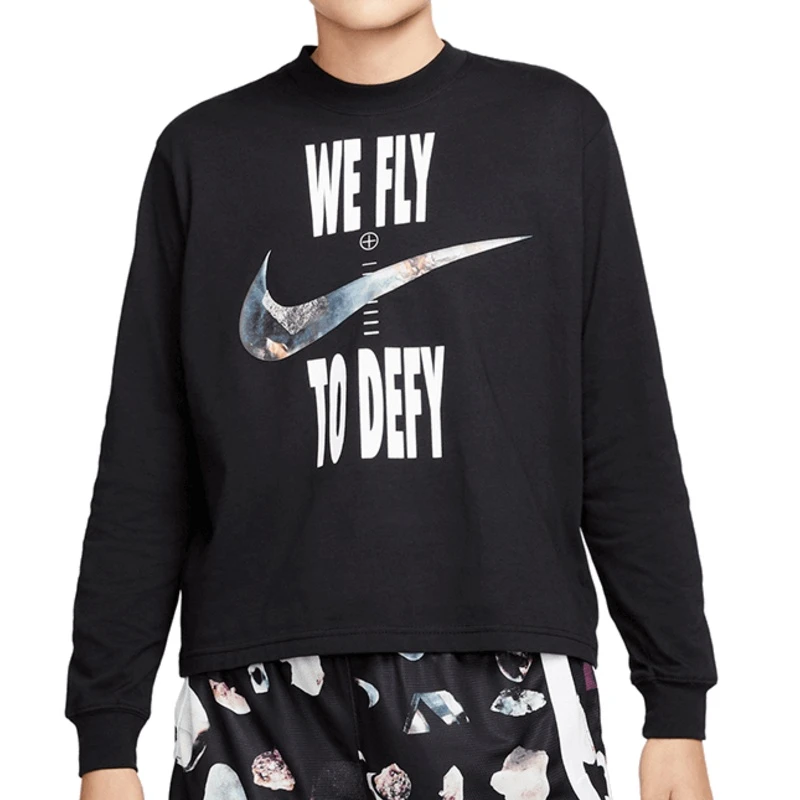 - Style für Damen: Die “WE FLY TO DEFY”-Grafik wurde von einer Nike Basketball-Werbung für den Air Force 3 aus den 80er Jahren inspiriert, in der die Frage gestellt wurde: “Who Said Woman Was Not Meant To Fly”.